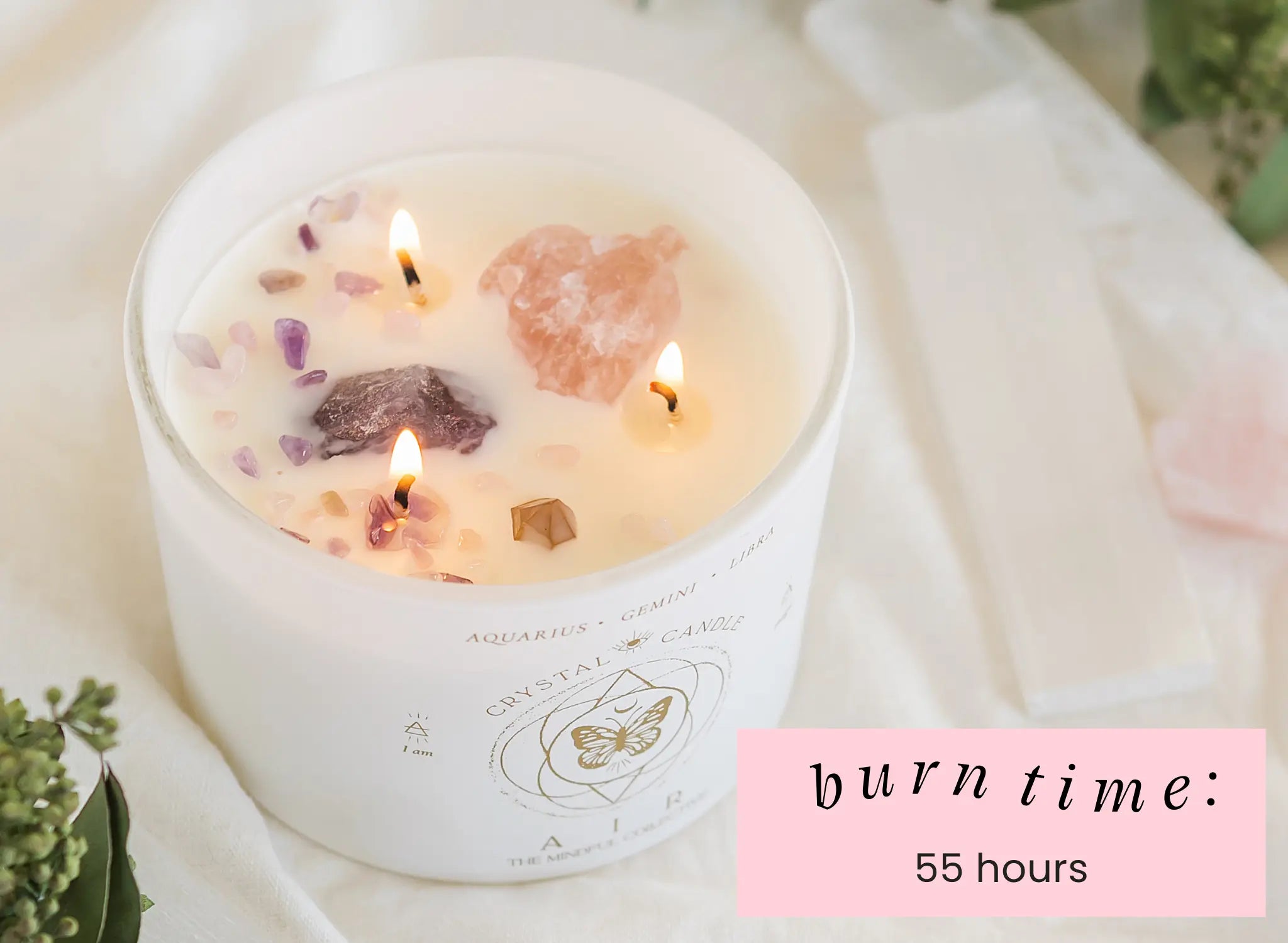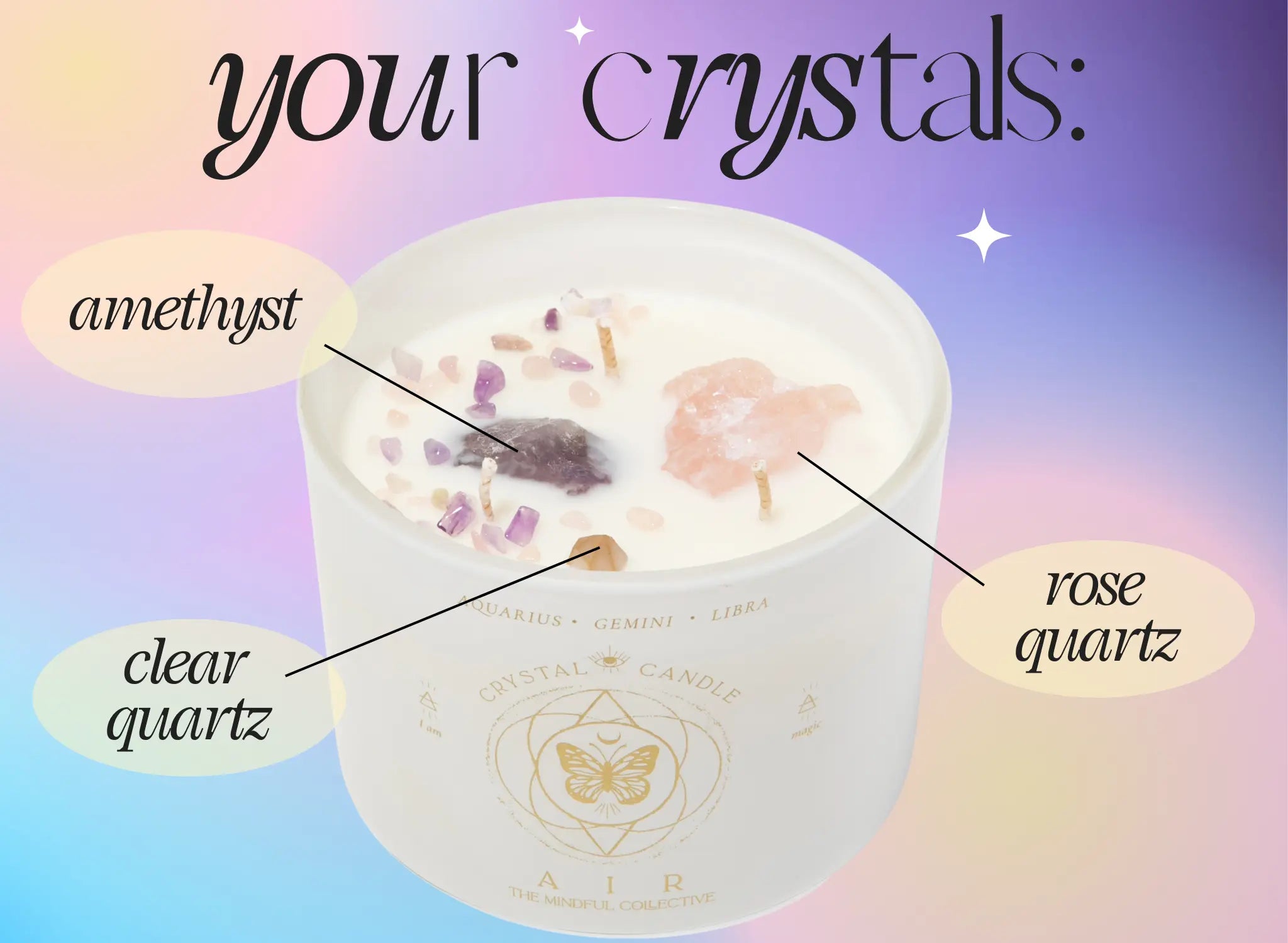 A 12oz Crystal Candle with Rose Quartz, Amethyst, and Clear Quartz. Made for Gemini, Libra & Aquarius Astrological Signs.