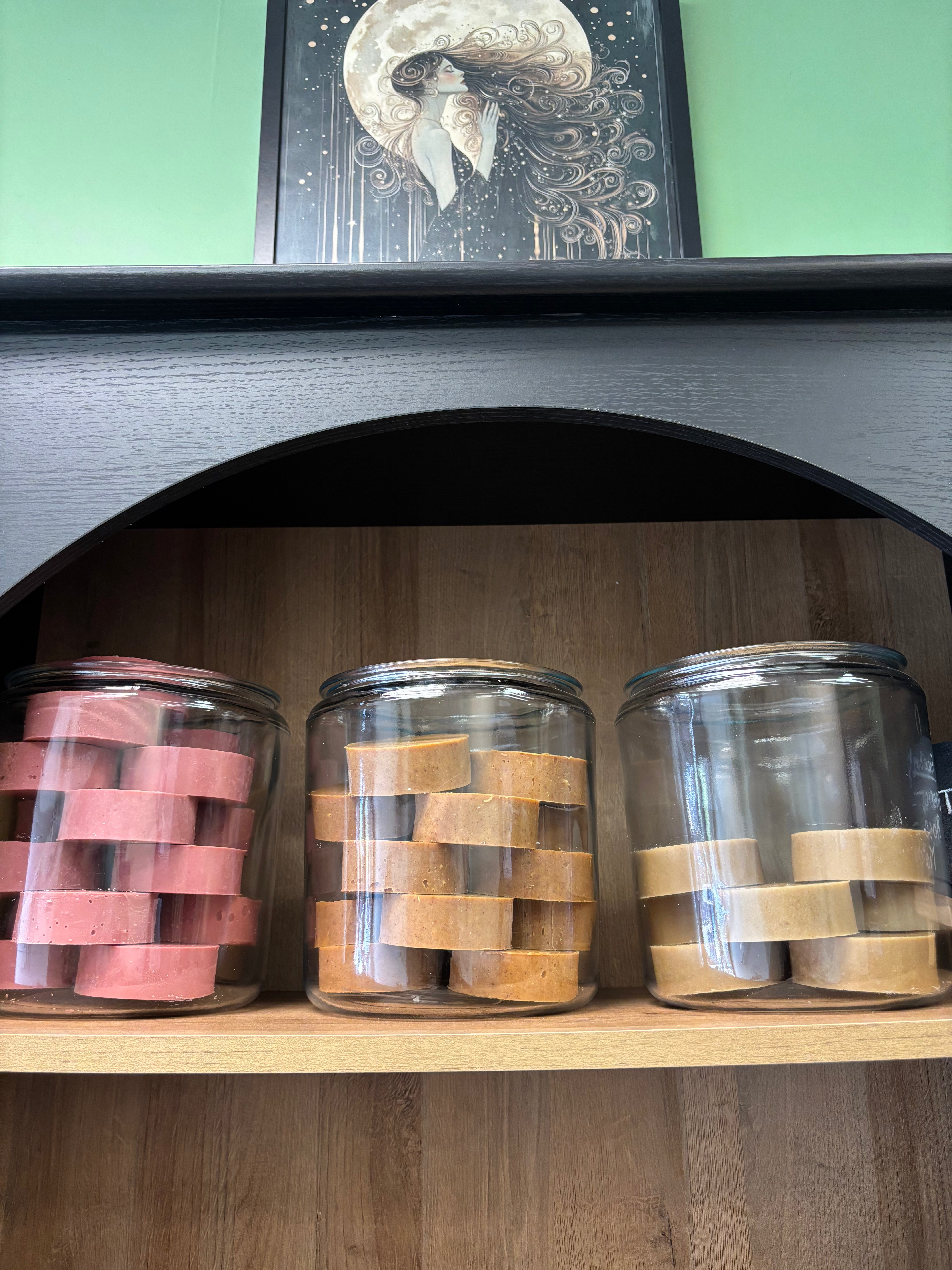 Reveal your skin’s natural radiance with our Mystical Glow Face Bars—a luxurious trio of cold-processed facial soaps handcrafted to elevate your self-care ritual. Each bar is made with a nourishing base of shea butter, mango butter, castor oil, olive oil, coconut oil, and jojoba oil to hydrate, soften, and restore the skin’s natural barrier.