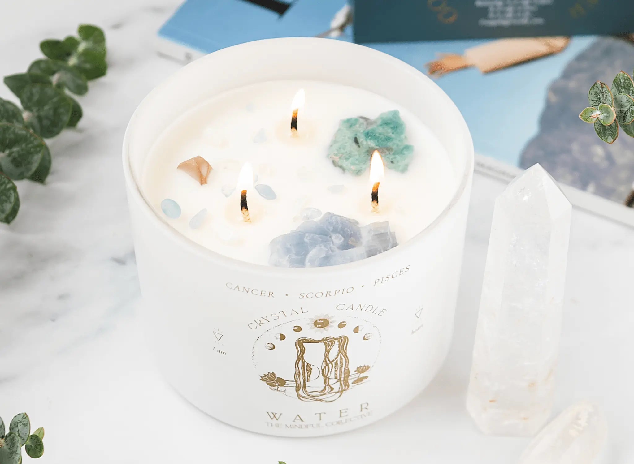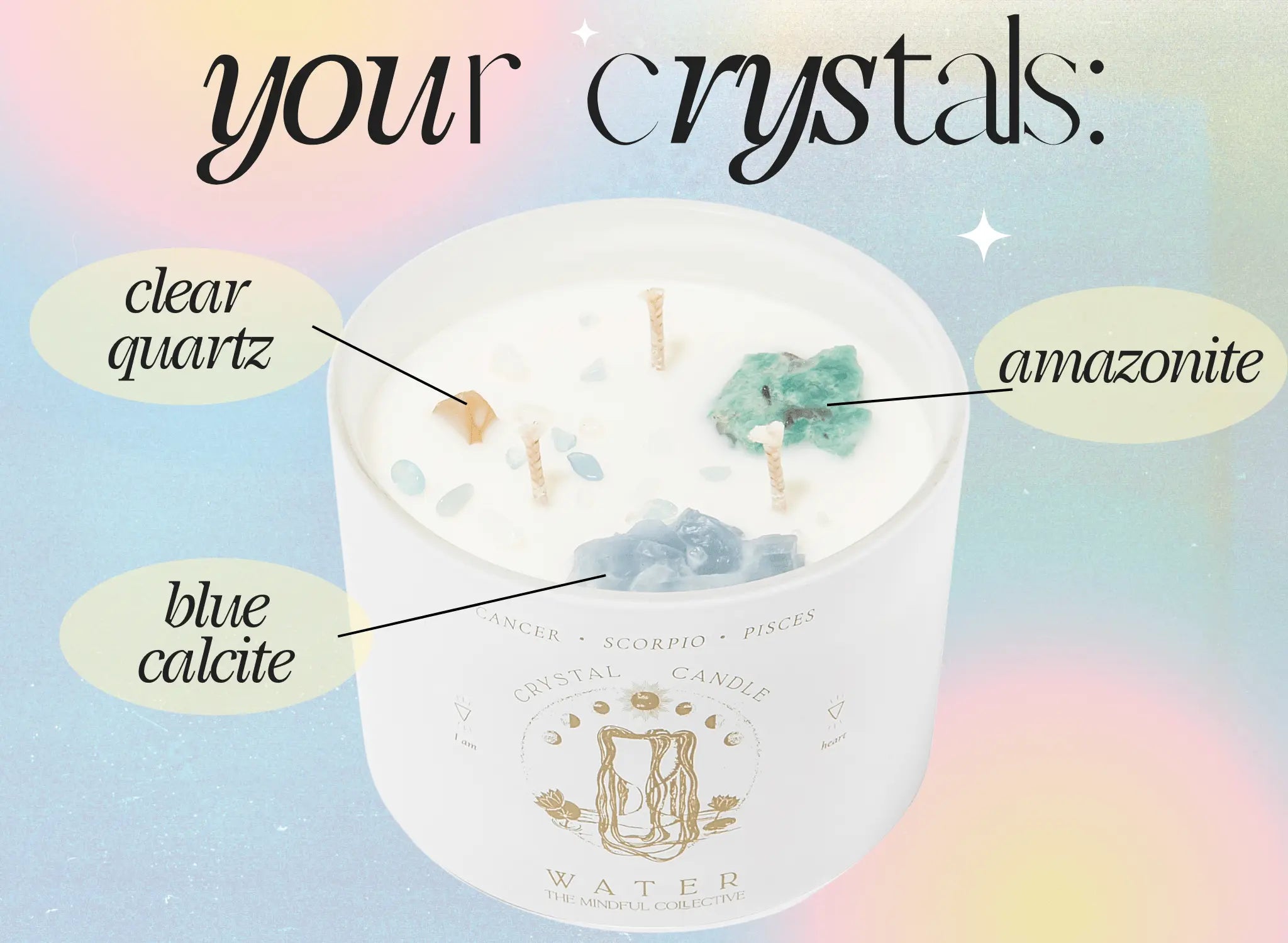 A 12oz Crystal Candle with Blue Calcite, Amazonite, and Clear Quartz. Made for Cancer, Scorpio, & Pisces Astrological Signs.
